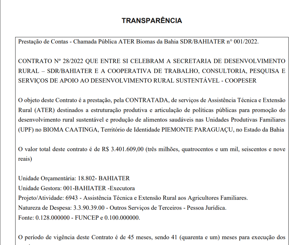 Serviços de Assistência Técnica e Extensão Rural (ATER) destinados a estruturação produtiva e articulação de políticas públicas para promoção do desenvolvimento rural sustentável e produção de alimentos saudáveis nas Unidades Produtivas Familiares (UPF) no BIOMA CAATINGA, Território de Identidade PIEMONTE PARAGUAÇU, no Estado da Bahia.
